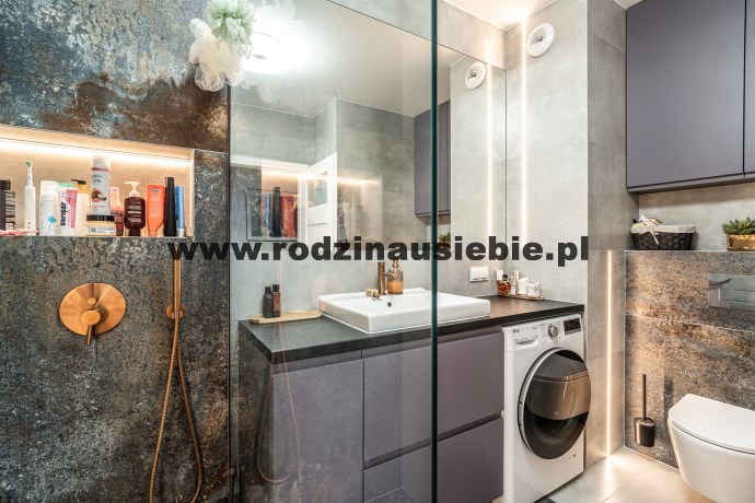 Łazienka urządzona w nowoczesnym stylu, z dbałością o detale i funkcjonalną zabudową. W całym mieszkaniu położona jest naturalna deska barlinecka, a wszystkie materiały wykończeniowe są najwyższej jakości, co nadaje wnętrzom prestiżowy i elegancki charakter.