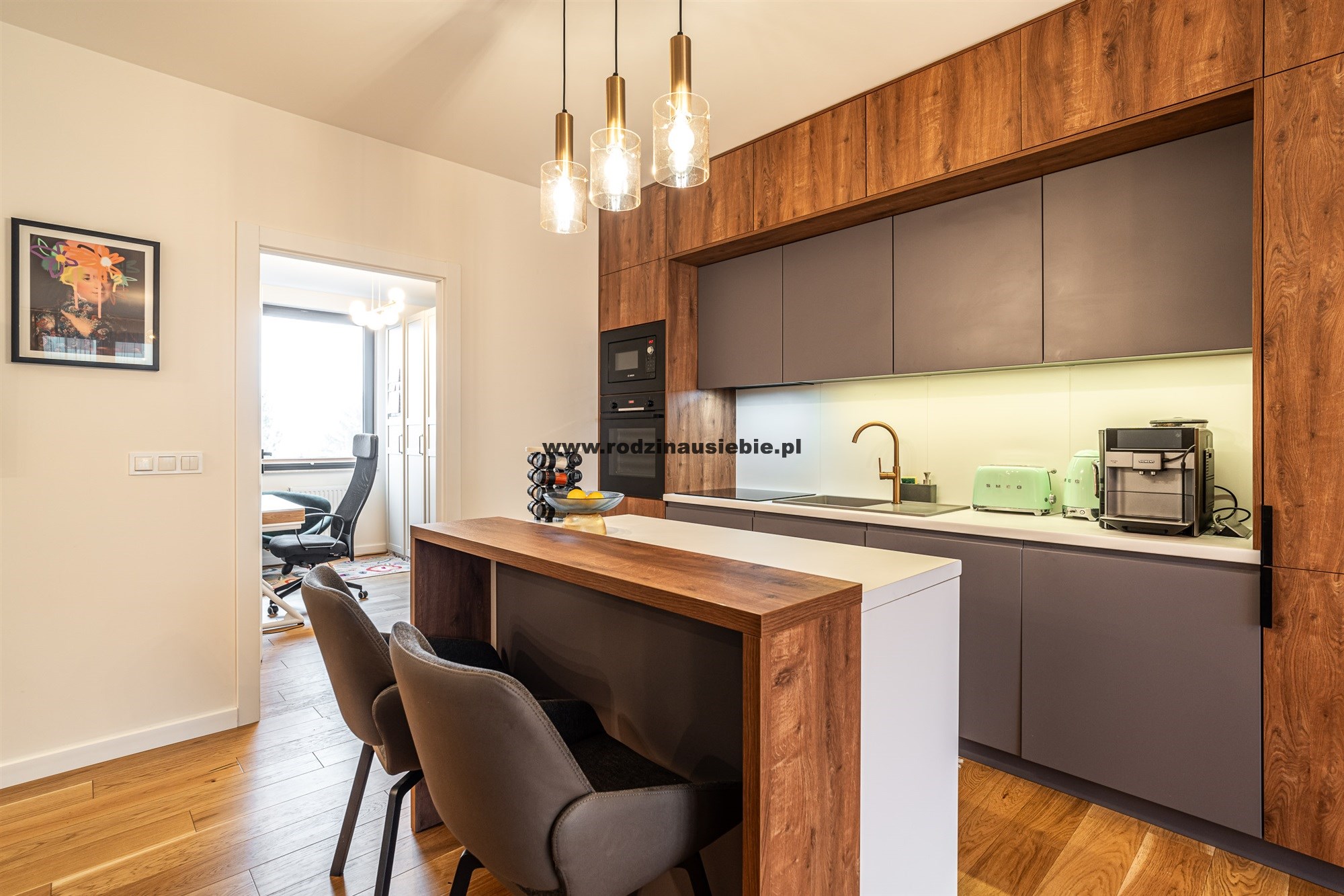 Z salonu prowadzi wyjście na taras o powierzchni około 10 m² – idealne miejsce na poranną kawę, odpoczynek po pracy lub spotkania z rodziną i przyjaciółmi. Kuchnia wykonana na wymiar, w pełni wyposażona w nowoczesny sprzęt AGD, z wyspą i dużą ilością szuflad, zapewnia komfort nawet najbardziej wymagającym miłośnikom gotowania.